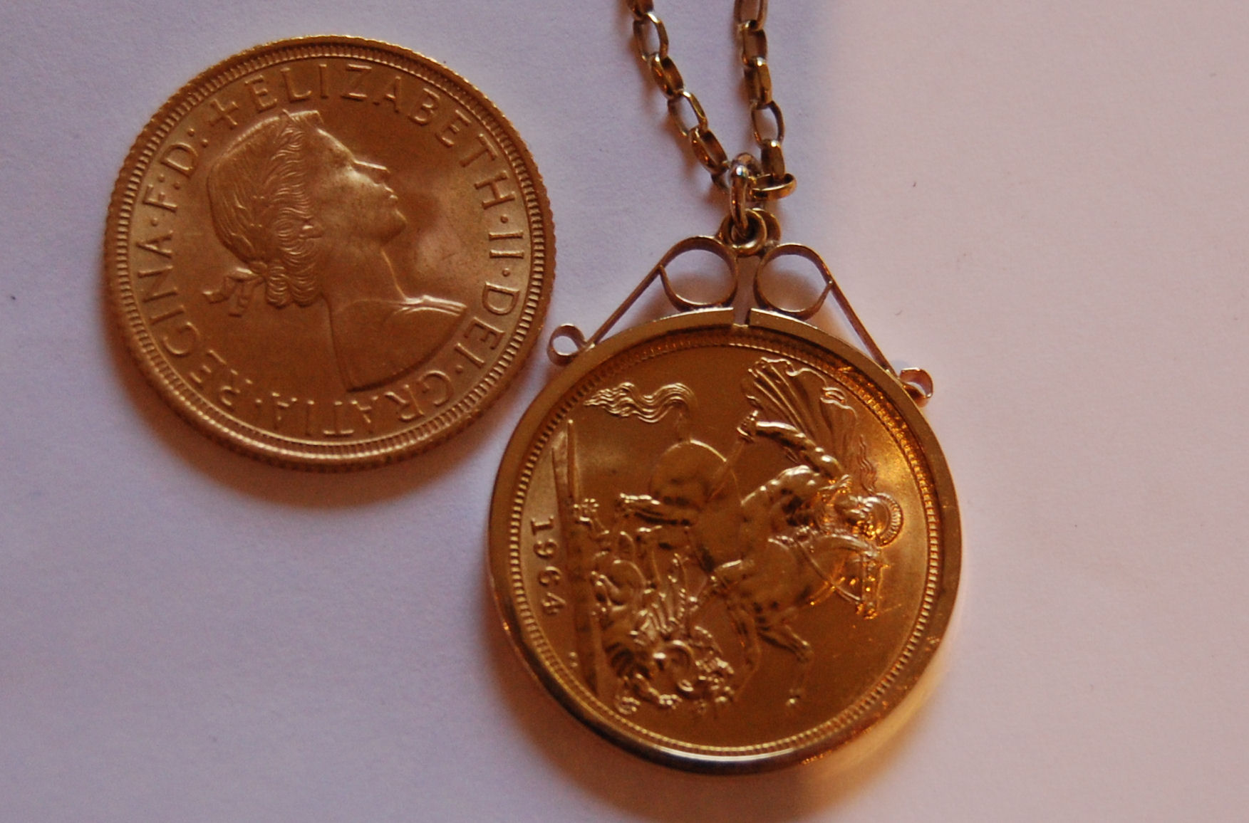 in collar mount with belcher link chain; together with 1958 sovereign (2)
