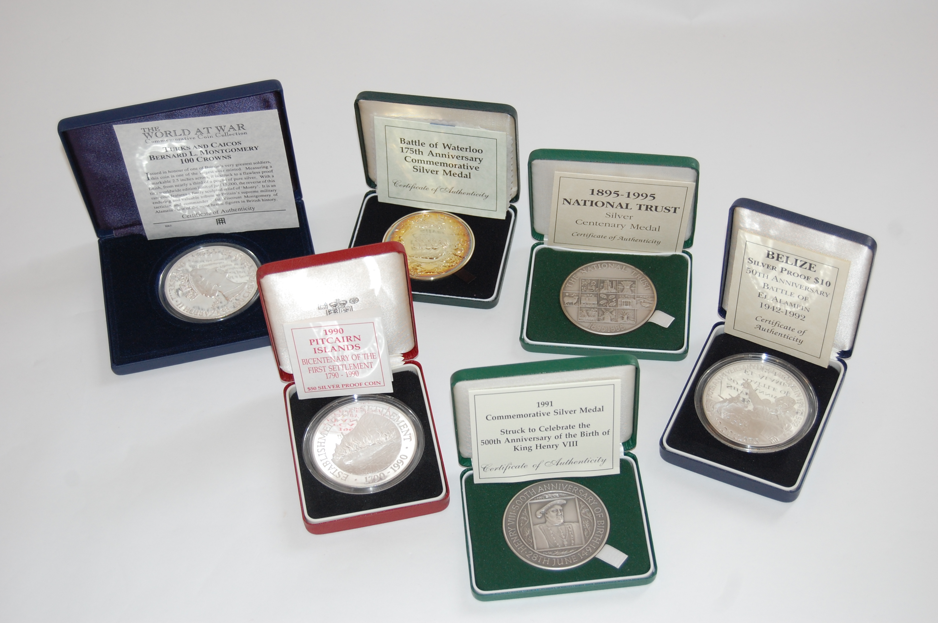 to include Turks and Caucos 100 crown; Belize $10; Pitcairn Islands $50; 1895 - 1995 National Trust medallion; 175th anniversary of Waterloo medallion; 1991 Henry VIII 500th anniversary medallion (6)