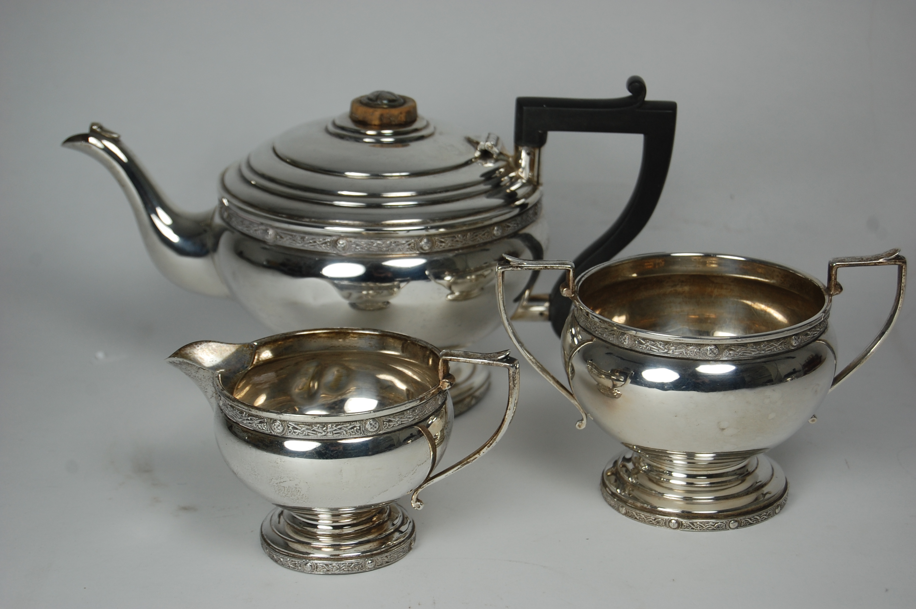 Birmingham 1935, comprising teapot, twin handled sugar bowl and milk jug, each with tapered bellied body with applied Celtic borders and angular handles (3)
