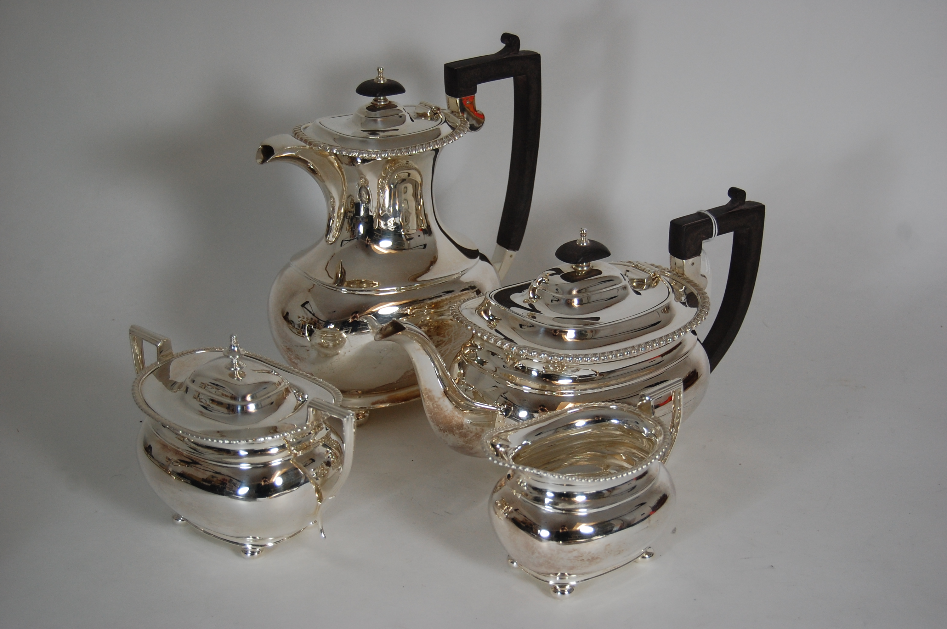 Mappin & Webb, Sheffield 1979 (sugar bowl 1977), comprising water pot, teapot, covered twin handled sugar bowl and milk jug, each of slight baluster form with gadrooned rim and angular handles raised on ball feet (4)