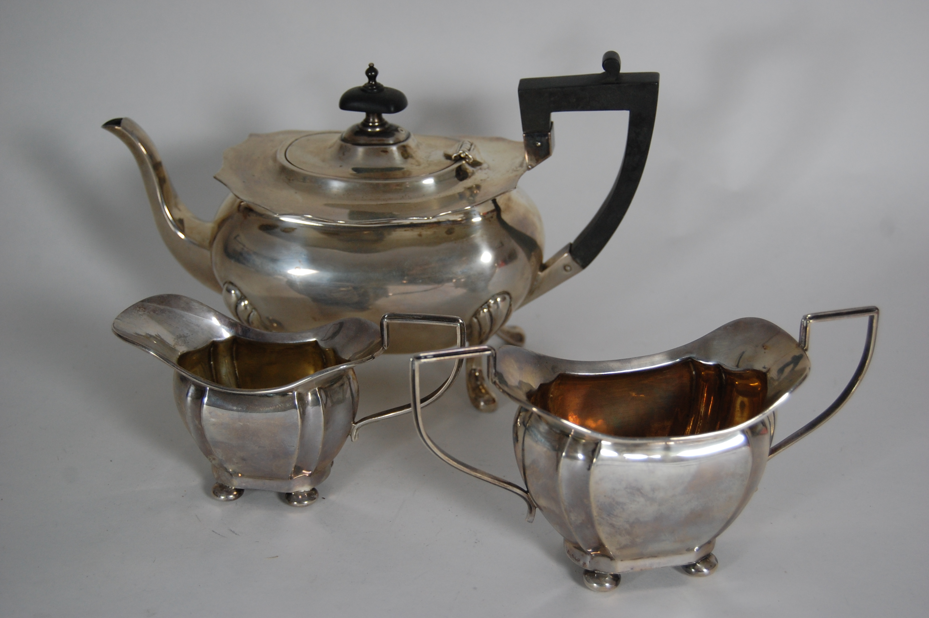 JC Ltd, Birmingham 1938, comprising teapot, twin handled sugar bowl and milk jug, each with canted fluted corners and raised on compressed ball feet (3)