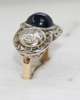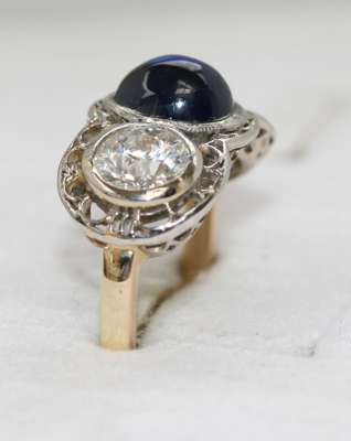 the central collet set high-domed oval cut sapphire cabochon of a pleasing strong blue hue, flanked to either side by a similarly set early round brilliant cut diamond, with outer circular pierced border