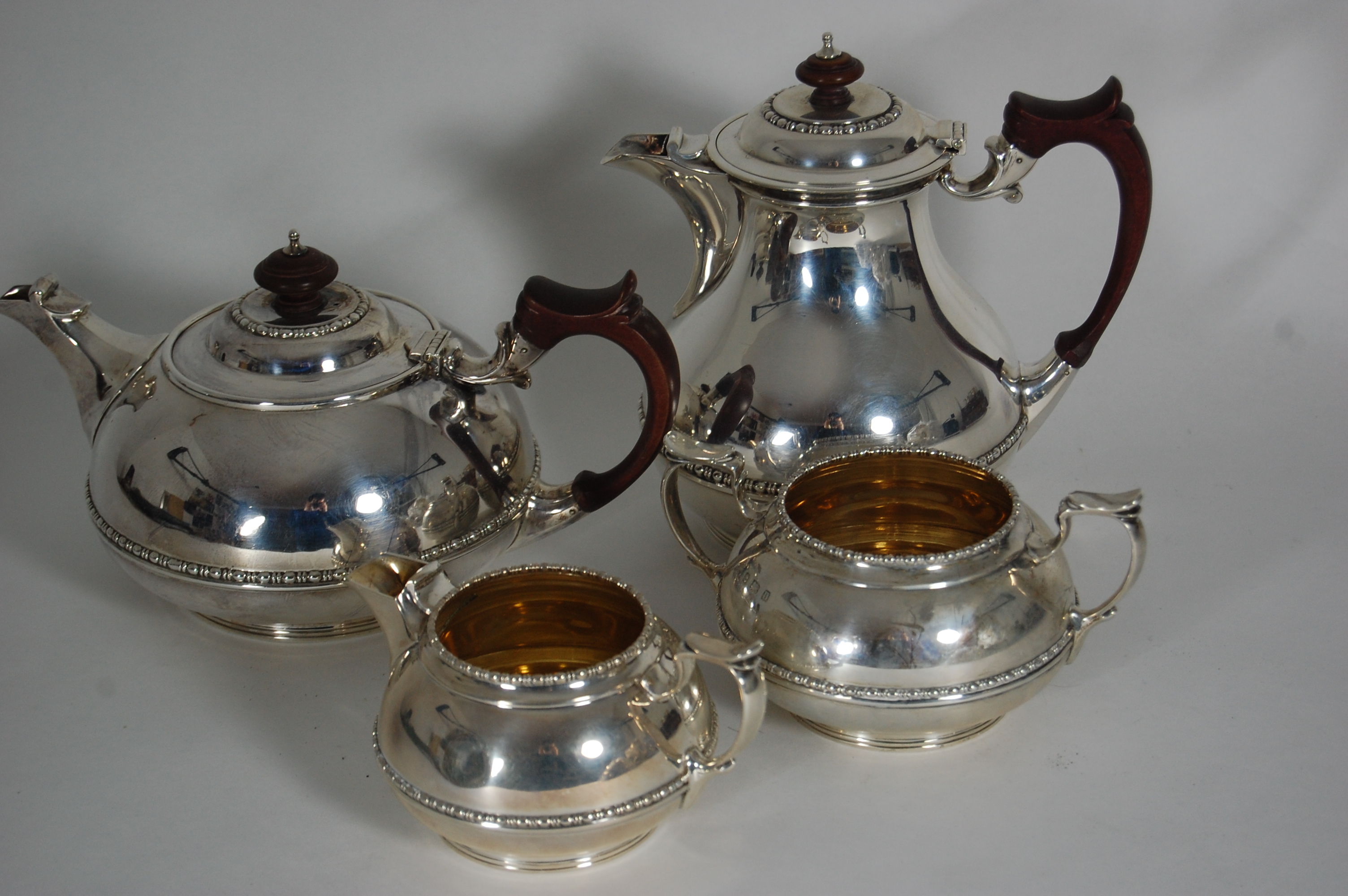 Elkington & Co, Birmingham 1937, comprising teapot, water pot, twin handled sugar and milk jug, each of simple form with beaded rims and girdle, with scrolled handles (4)