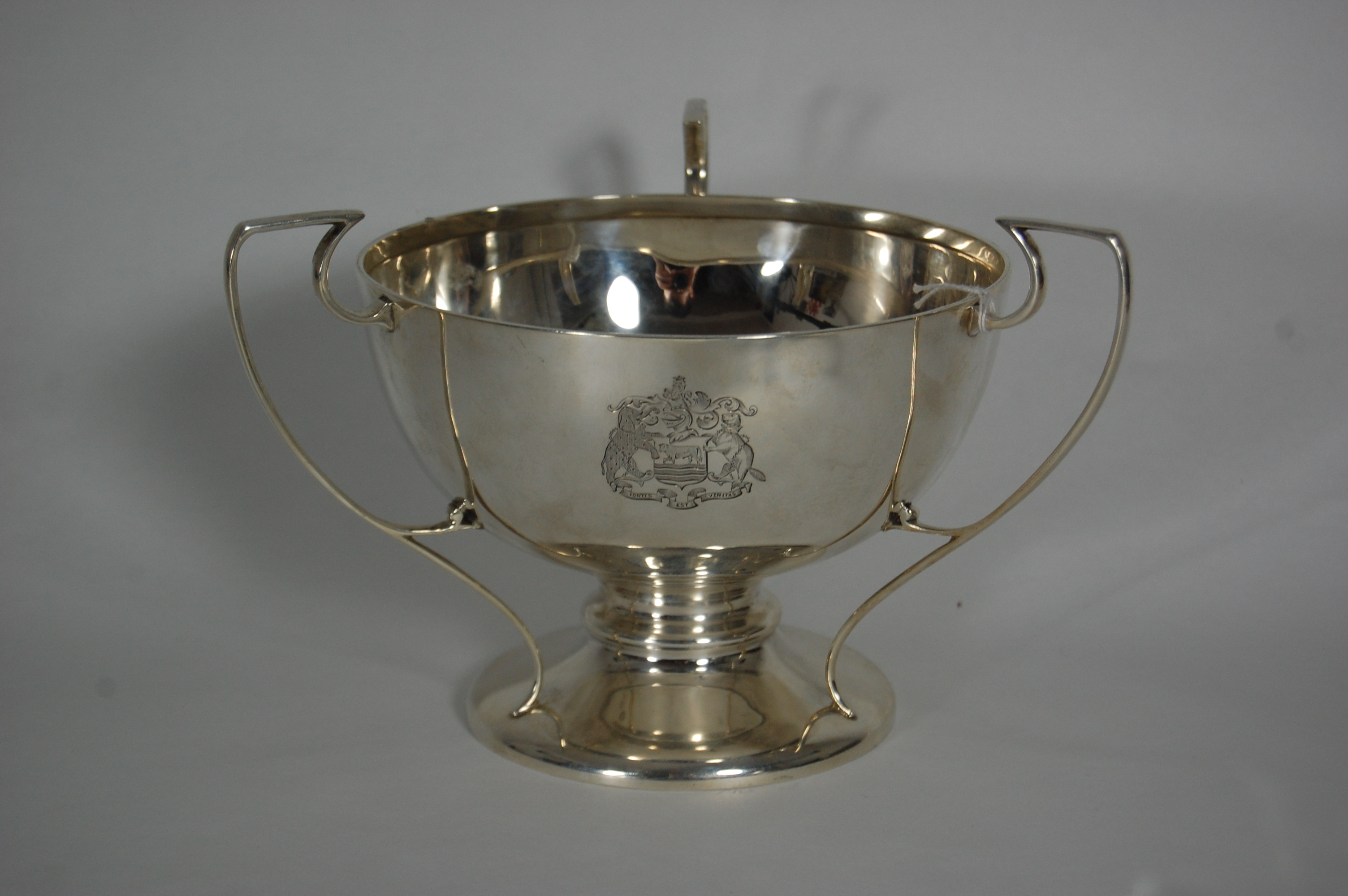J Dixon & Sons Sheffield 1919, retailed by Harris & Turner of Oxford, the deep bowl with triple S scrolling handles and raised on waisted knopped stem and domed foot, the body engraved with arms of Oxford