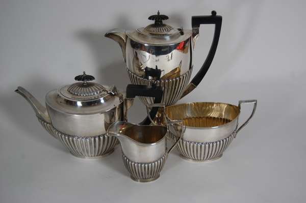 Birmingham 1908, water pot Sheffield 1904, comprising water pot (with presentation inscription) tea pot, large twin handled sugar bowl and milk jug, the bodies of tapered form with fluted lower sections, each with angular handles; together with a matched pair of silver plated sugar tongs (5)