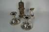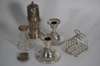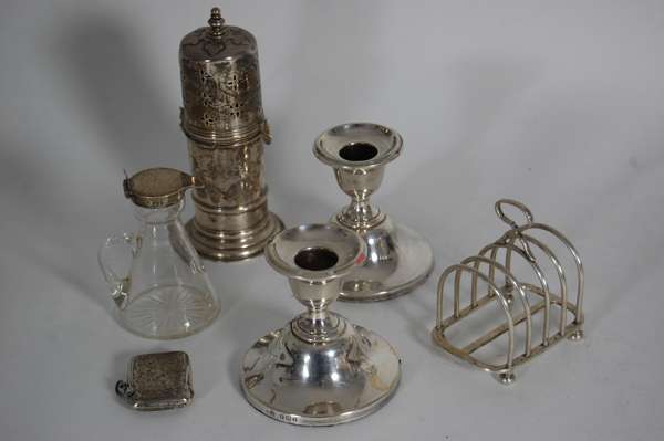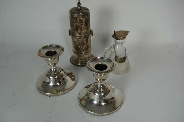 to include a lighthouse caster, London 1922; a pair of simple sauceboats with reeded rims, Birmingham 1915; also to include various items including two whisky noggins, a desk inkwell, mustard pot and spoon etc (qty)