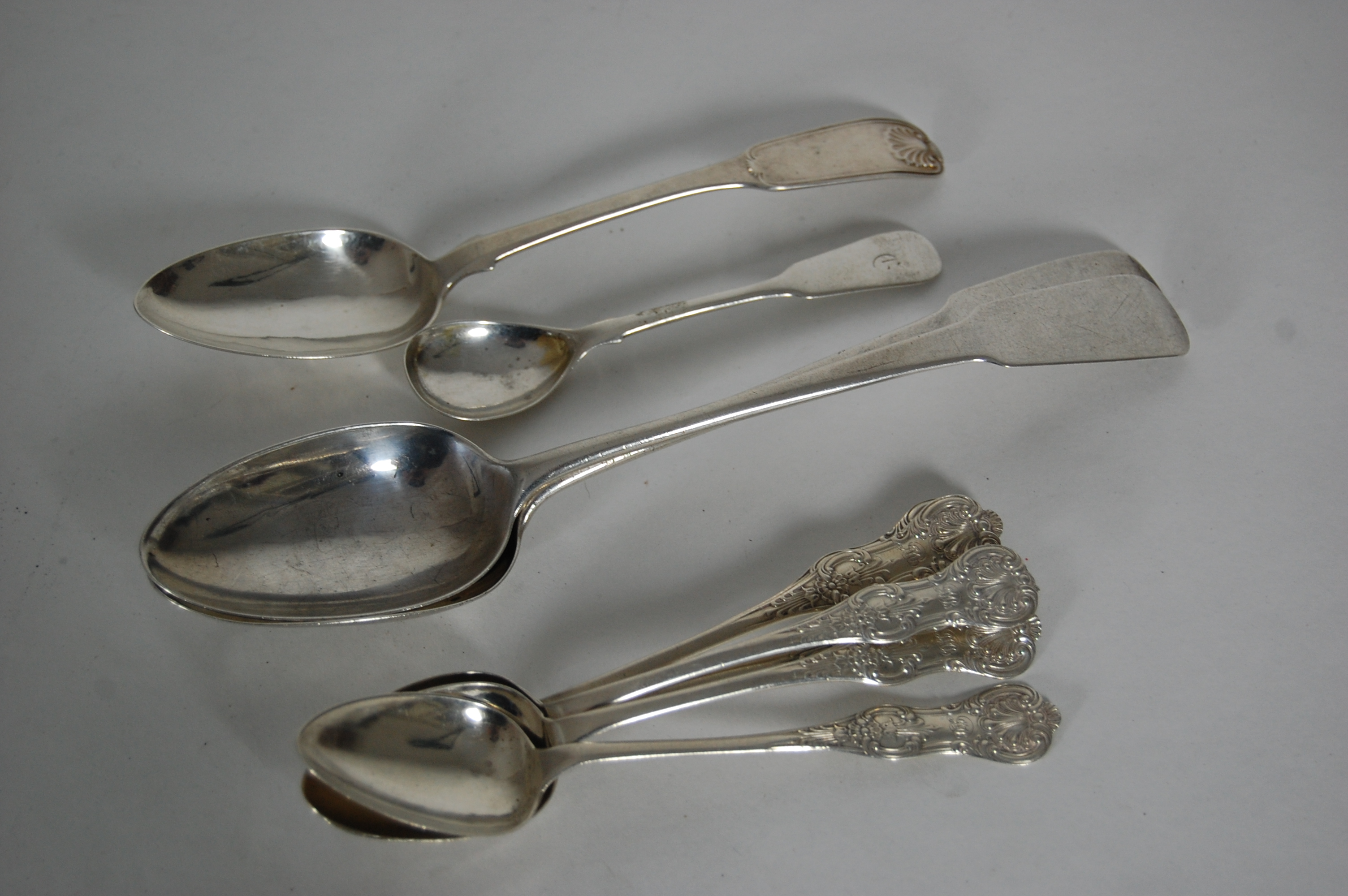 to include a pair of Fiddle pattern tablespoons struck maker's mark only for J Clarke of Greenock; a Fiddle thread and Shell pattern dessert spoon J Heron, Edinburgh 1819; a Fiddle pattern mustard spoon J Heron, Glasgow 1827; and a set of six Queen's pattern teaspoons, A Clarke Glasgow 1857 (qty)