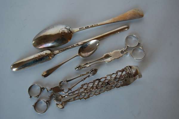 to include a fancy back marrow scoop, London 1770, of conventional double scoop form with scroll detail to larger bowl; a fancy back tablespoon London1759, the reverse of bowl with flower head and scrolls; a fancy back teaspoon (marks rubbed) with pot of flowers to reverse of bowl; together with two pairs of sugar nips and a pair of open work tongs (6)