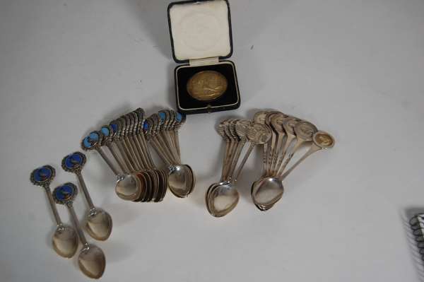 Elkington & Co, various dates, each with enamelled plaque to terminal featuring a pigeon; together with a cased silver medallion inscribed for the 'Yorkshire Fat stock society 1933' ; together with a group of 'Great Dane Club' and 'The National Dog Show' prize spoons (31)