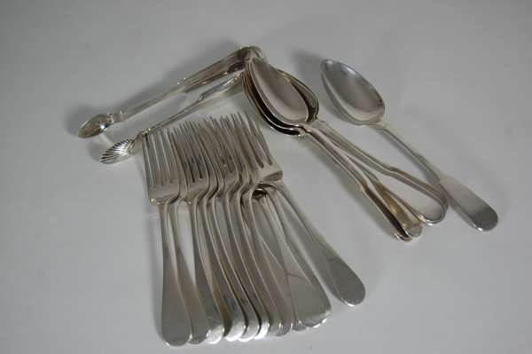 D Macdonald Glasgow 1821, of Fiddle pattern with vacant terminal; together with a pair of Fiddle pattern sugar tongs with fluted bowls Glasgow 1823 (A/F); and a set of twelve dessert fork Edinburgh 1822 with erased terminals (19)