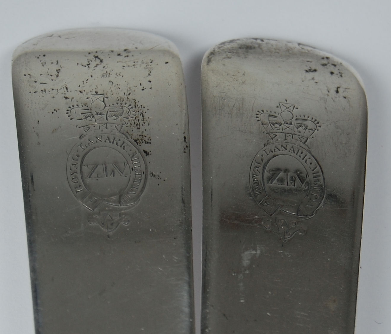 P Cunningham & Sons, Edinburgh 1810, of Fiddle pattern with engraved emblem of crowned garter surrounding XLV named 'Royal Lanarkshire Militia' within (2)