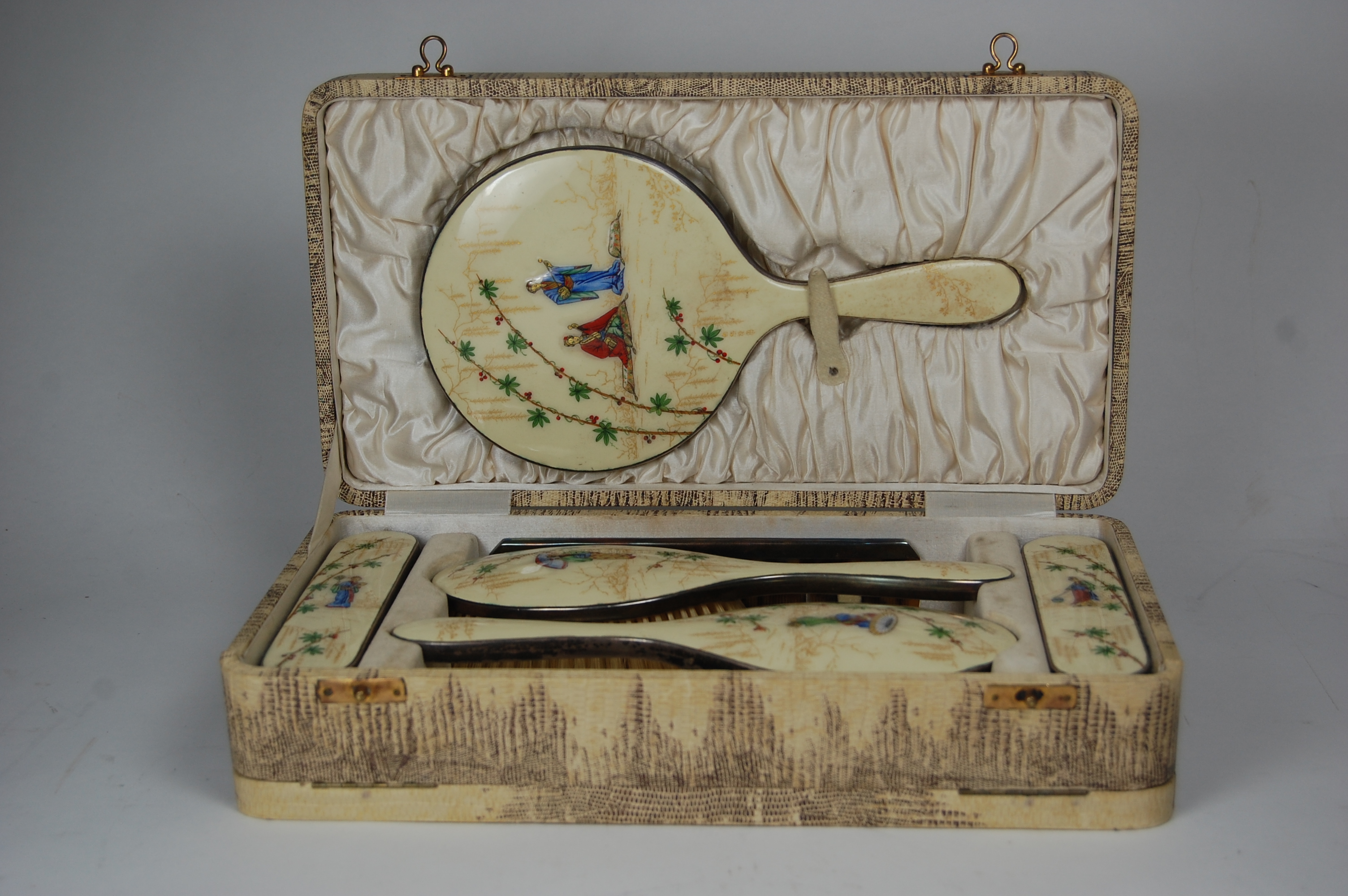 HCD, Birmingham 1902 comprising a pair of hair brushes, pair of clothes brushes, comb and hand mirror, each with design of chinese figures within traditional landscape, on buff ivory ground with gilt and polychrome highlights, in original fitted case