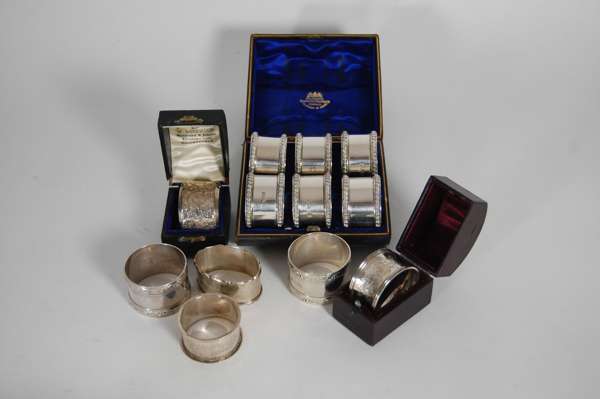 London 1896, of simple form with gadrooned rims and each numbered, in original case; together with two other cased napkin rings and four loose examples