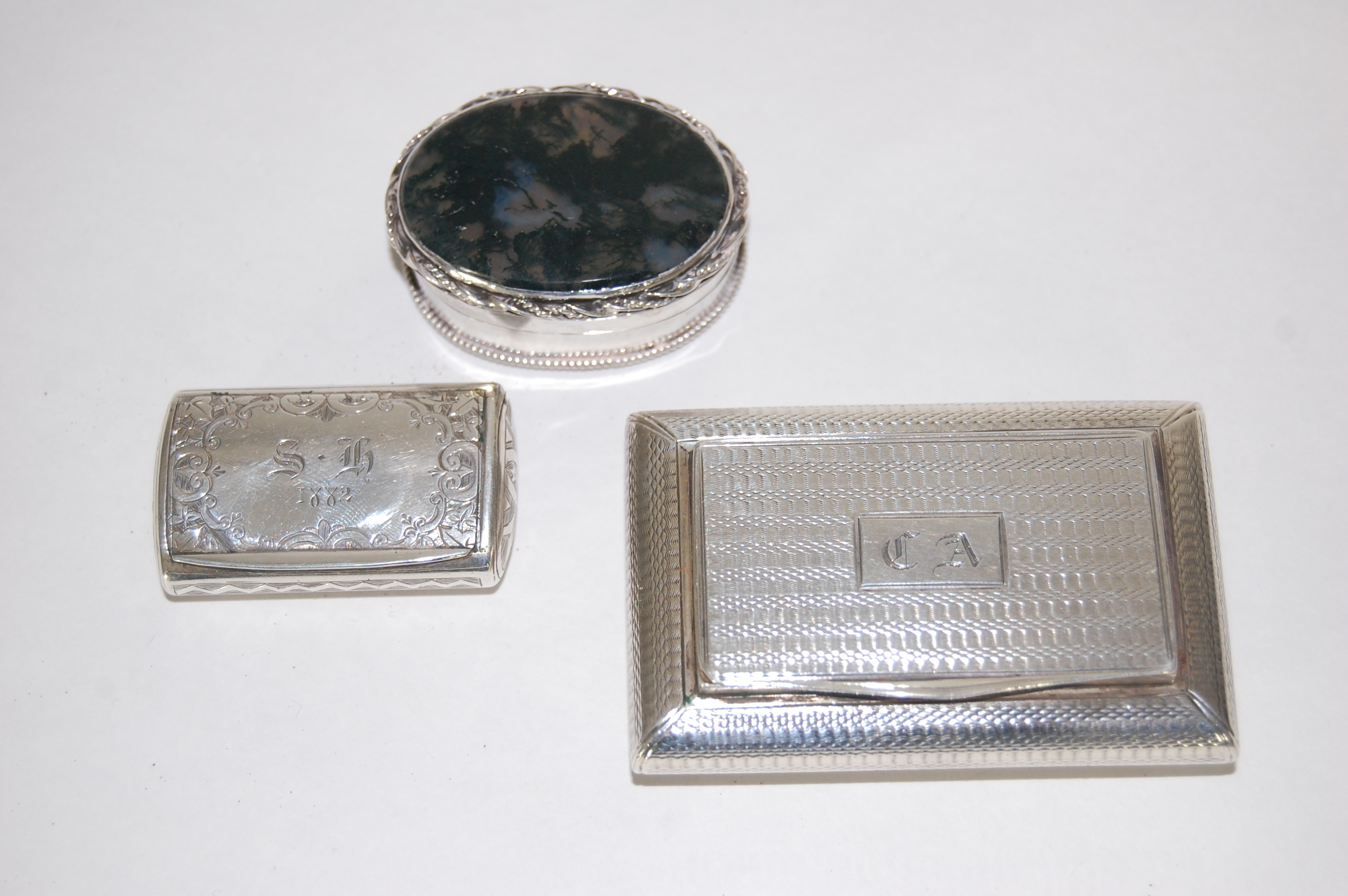 Birmingham 1834, of rectangular outline with all over engine decoration and engraved initials; together with a small Victorian snuff box, Birmingham 1860 with foliate engraved border and initials within and a moss agate lidded box with ropetwist border borders (3)