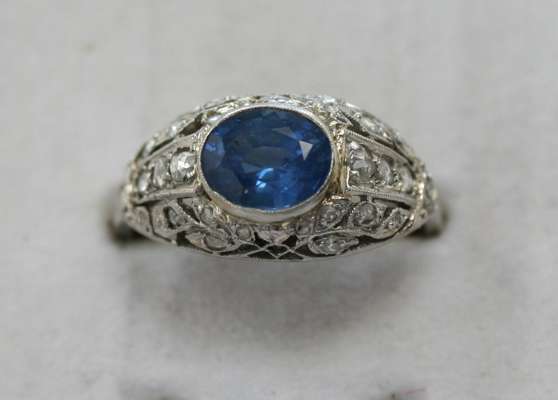 the domed front millegrain collet set to the centre with an oval cut sapphire, of a pleasing mid-blue hue, within a pierced surround millegrain set with graduated rose cut diamonds, with French control marks to the shank