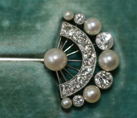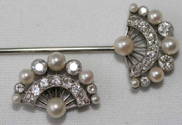 of traditional form with fan shaped terminals millegrain set inner border and graduated alternating pearl and diamond set outer borders, with a small opal bar brooch