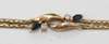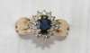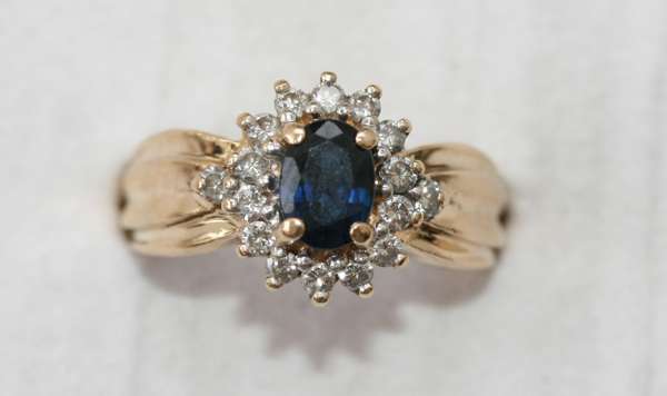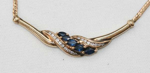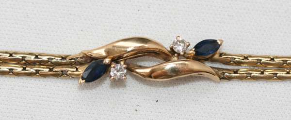 a 14k gold ring, set with a central oval sapphire within a diamond claw set border, moulded shoulders; an 18ct gold bracelet, the central section set oval sapphires with diamond accents, double strand bracelet; the 9k gold necklace with central motif set graduated row of oval shaped sapphires with two rows of graduated circular cut diamonds to each side, herringbone link neck chain (3)
