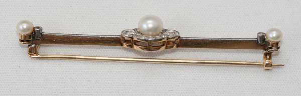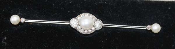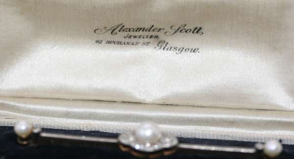 composed of a split white gold faced knife edge bar, applied to the centre with a bouton pearl measuring approximately 6.5mm diameter, within a shaped oval surround millegrain set with old European and single cut diamonds, additionally set to each terminal with a smaller bouton pearl and single cut diamond (pearls untested), contained in the original tooled beige leather fitted case, stamped ALEXANDER SCOTT...GLASGOW...