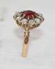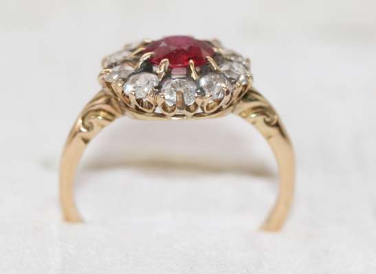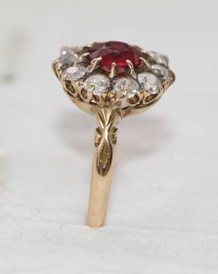 the circular cut ruby of deep colour, claw set and with a border of mixed cut circular diamonds, pierced gallery and chased shoulders all in 18ct gold