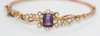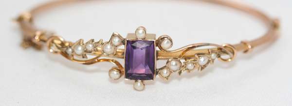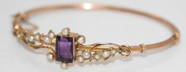 the rectangular cut amethyst within a scrolling pearl set surround on an oval section bangle, with safety chain
