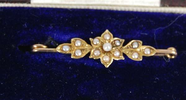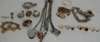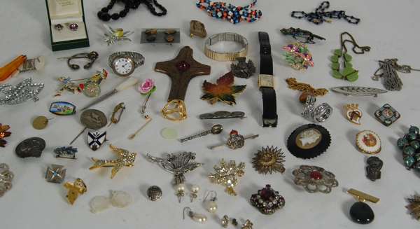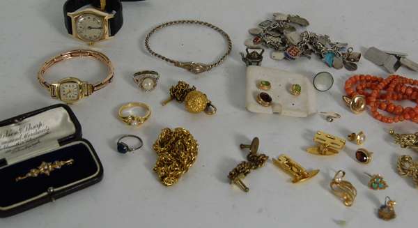 with various appendages; a lady's gold wrist watch, Omega watch; slight curved case; Victorian lockets and neck chains; seven various gem set rings; cased pearl set brooch; curb link bracelet with charms; mourning brooch; Scottish agate set penannular brooch; another circular agate set brooch; turquoise set bangle; and a selection of lesser jewellery in two bags