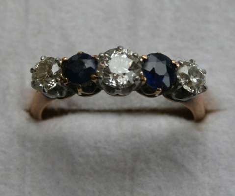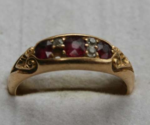 the circular cut stones claw set in platinum, 18ct gold shank, together with a Victorian small ruby and diamond ring, one diamond deficient