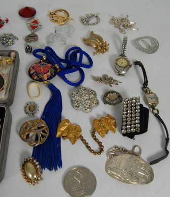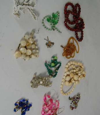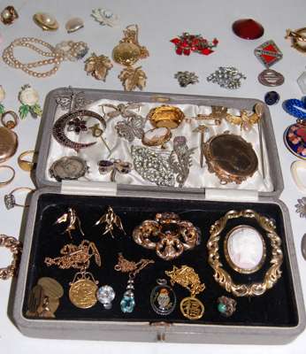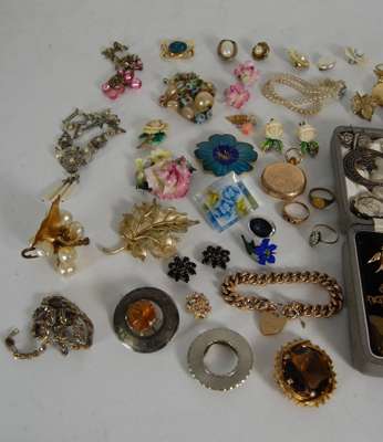 of graduated form, claw set in platinum, together with a half sovereign pendant and neck chain, a curb link bracelet with padlock, various pendants, Victorian gold rings, memorial brooches, swivel fob, garnet set crescent brooch, filligree and other brooches, a 14K gold cased hunter cased small pocket watch, a quantity of miscellaneous costume jewellery