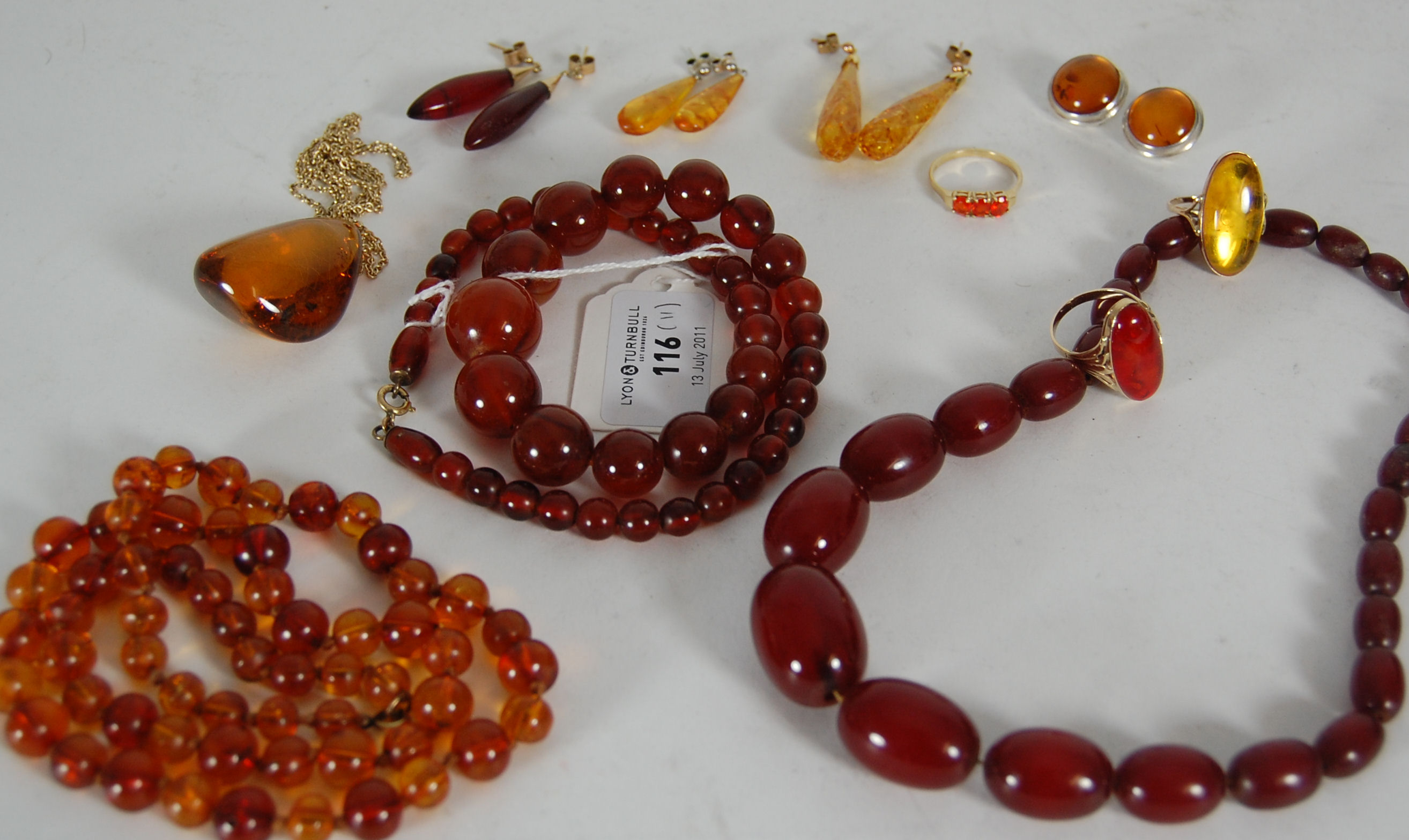 two large graduated necklaces; another of orange colour, three pairs of earrings; three gold and other dress rings and am amber pendant and chain