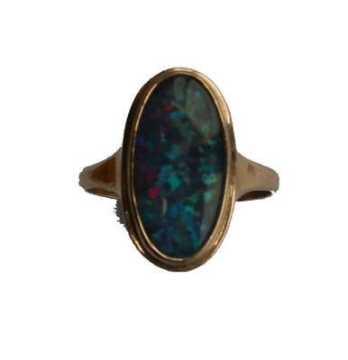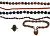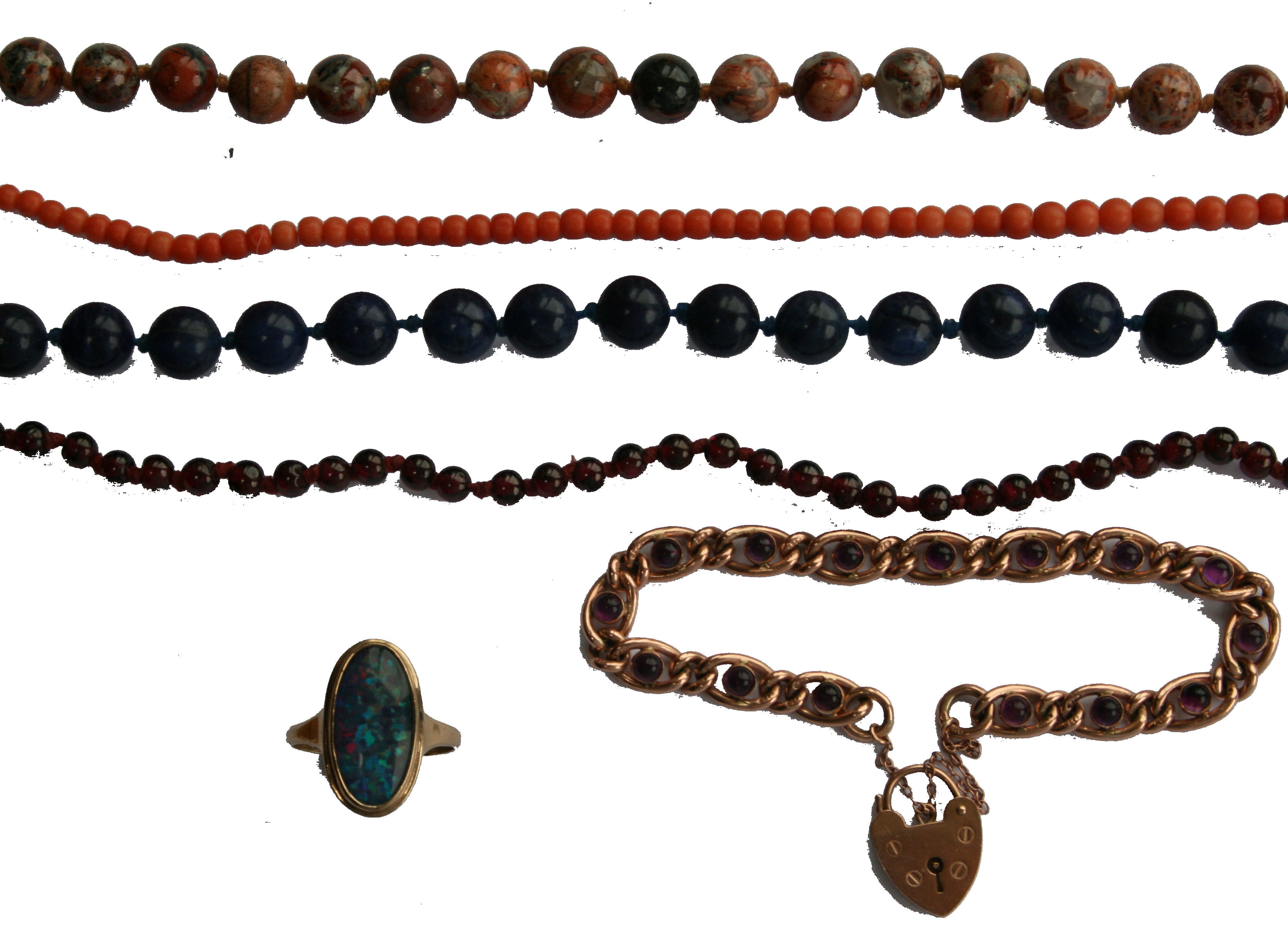 the long oval opal in rubover setting, together with a coral necklace; a lapis necklace; string ruby beads; a variegated agate necklace; a 9ct gold bracelet of oval links with applied amethyst cabochons