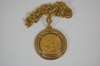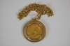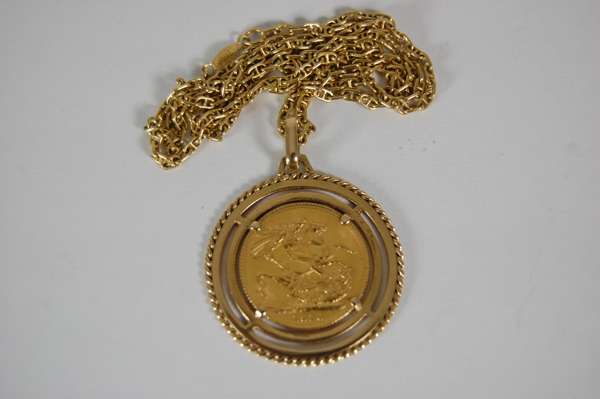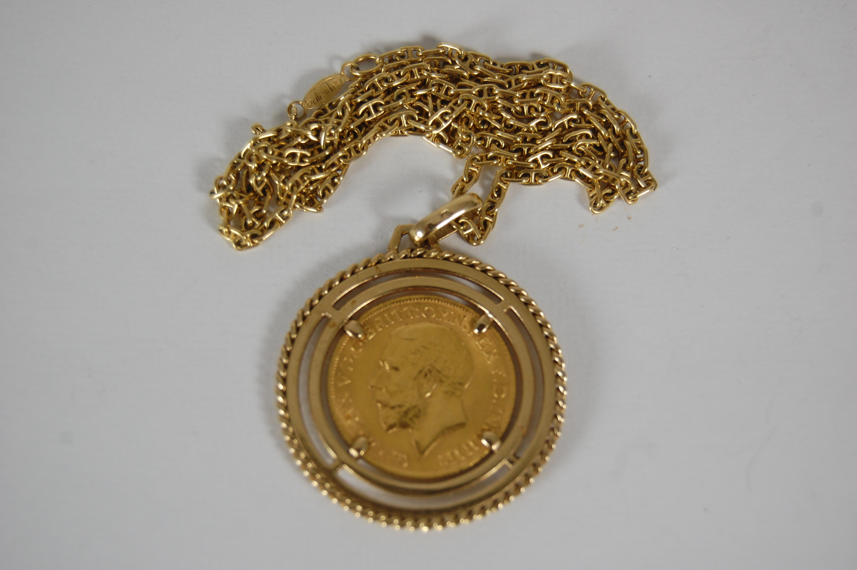 the 1916 sovereign, in circular clip mount with ropetwist border, suspended from an oval link 18ct gold chain