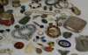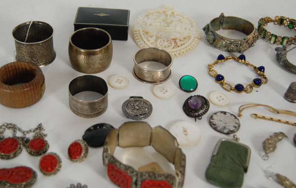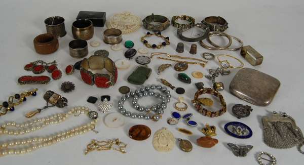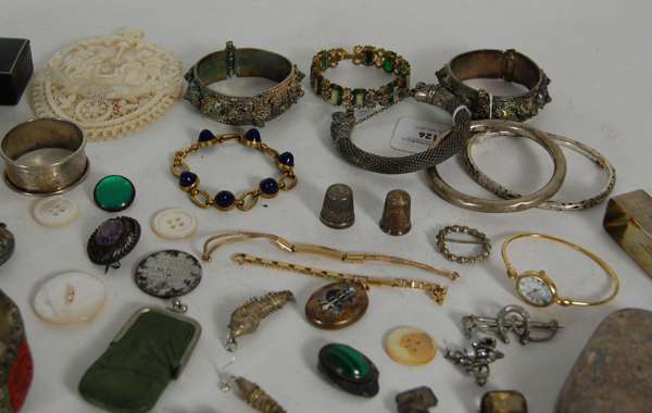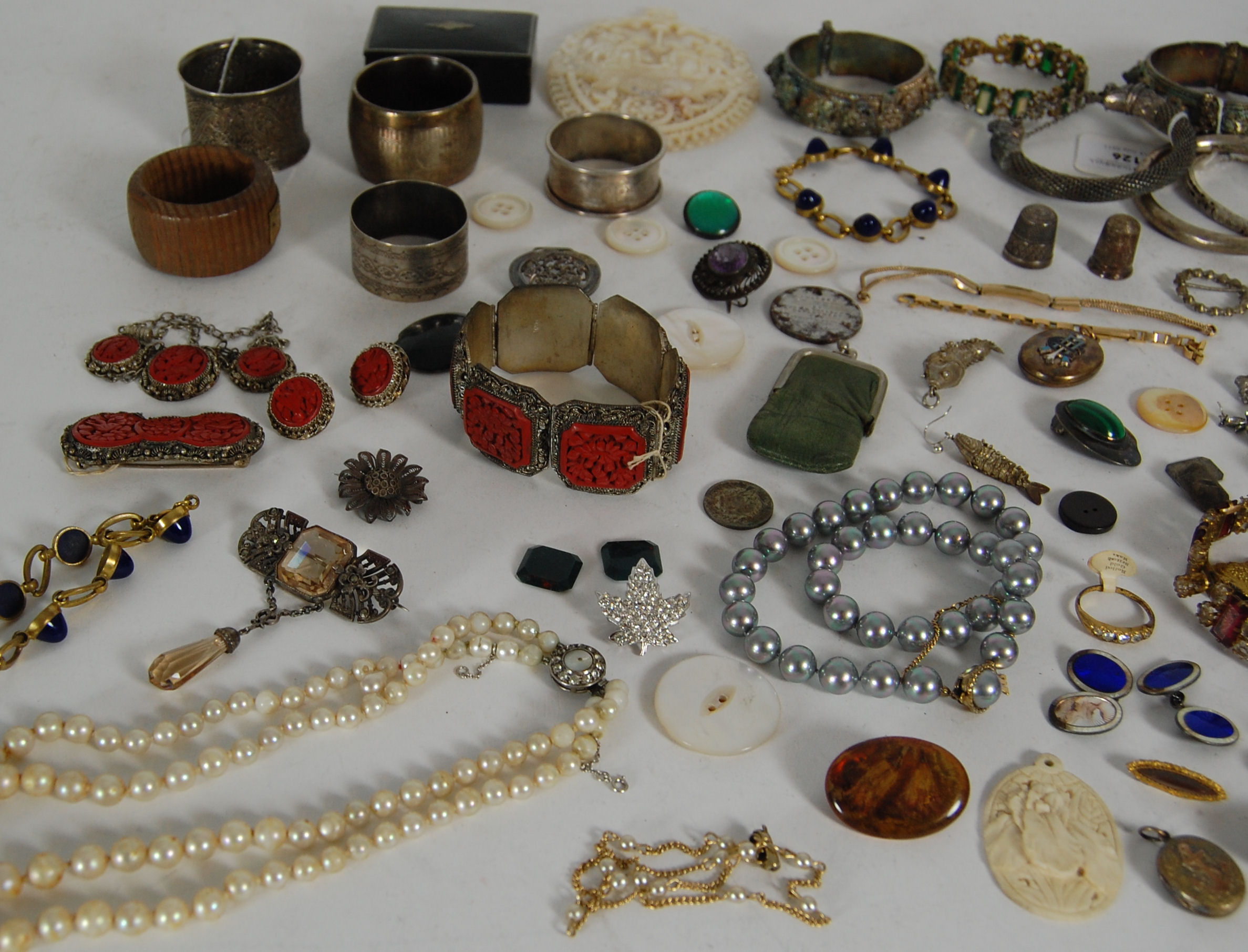 other similar bracelets, miscellaneous Victorian and other jewellery, coral set pieces, silver cigarette box, napkin rings including one made from decking of the Mauretania, a large carved mother of pearl pendant of the birth of Jesus