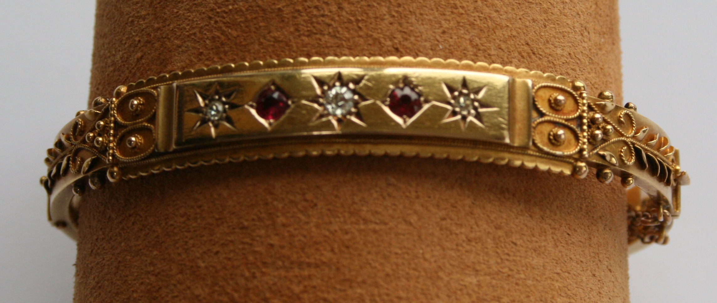 set three circular cut diamonds and two rubies of pleasing colour, applied wire work detail