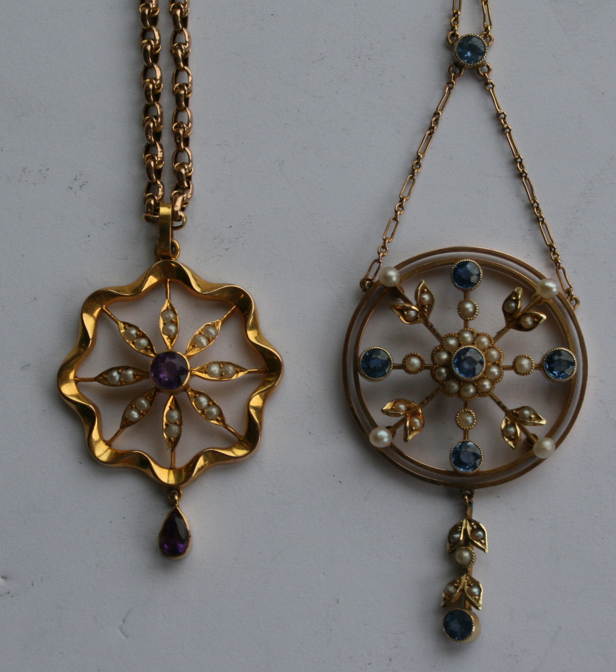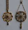two gem and seed pearl set pendants and gold chains; a tiger's eye quartz pendant and chain; a strand of Verdite beads; two strings of graduated green hardstone beads; two 'jet' necklaces and a string of graduated amber beads; a hardstone heart shaped pendant and chain and a 'book' locket