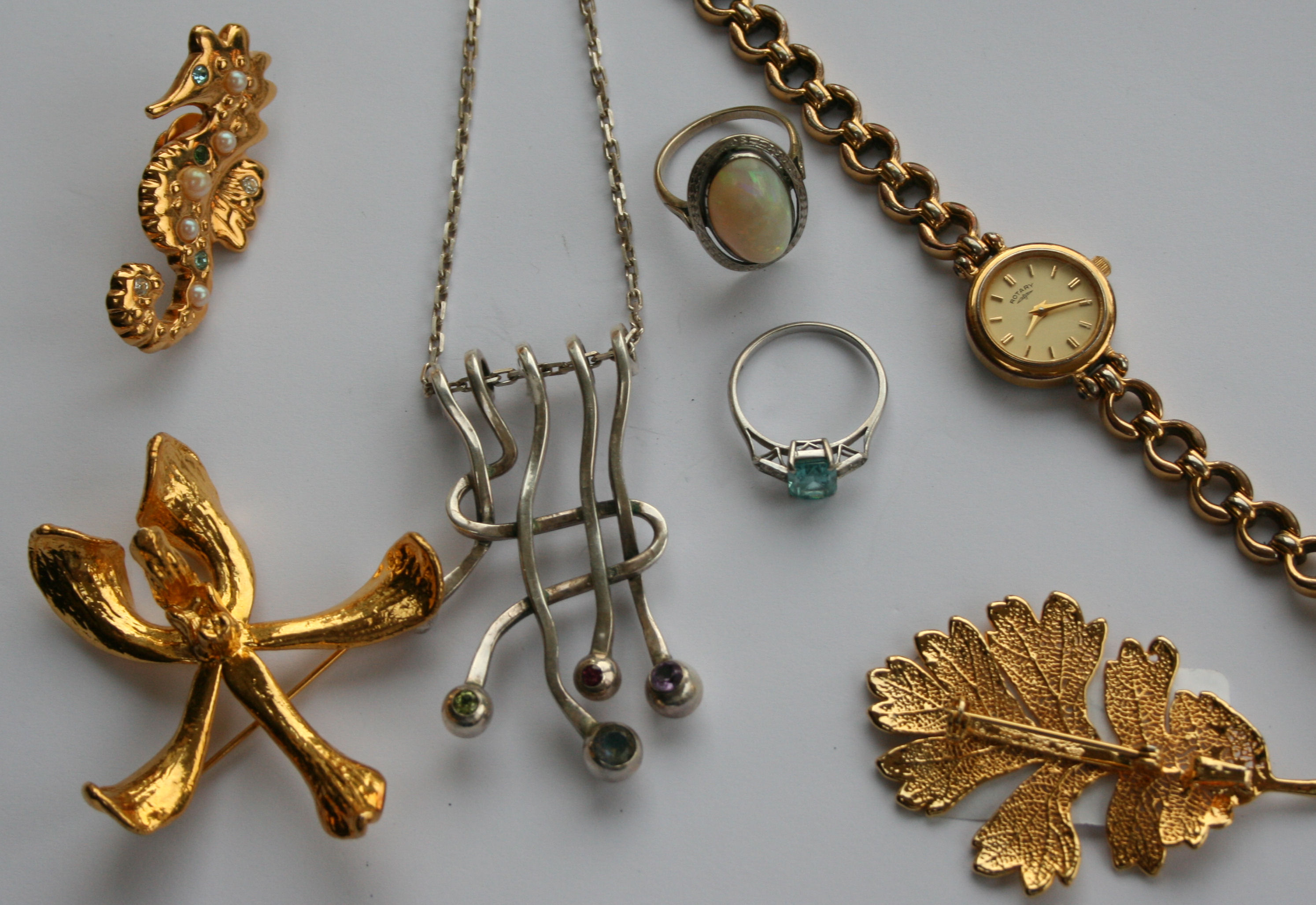 the oval cabochon in rubover setting with finely engraved border; a contemporary gem set pendant necklace with silver neck chain; three gilt brooches; a Rotary wrist watch and an aquamarine set ring, diamond set shoulders