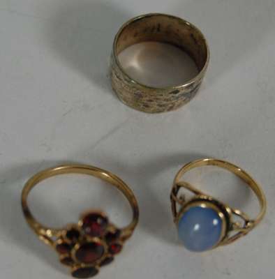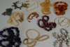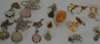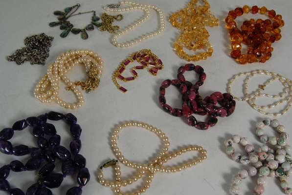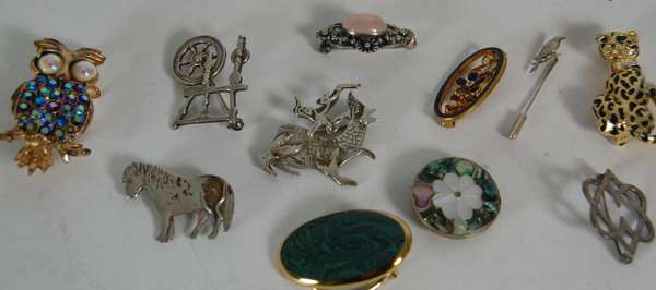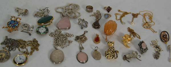 garnet set ring; pearl necklet; various silver necklaces and pendants; silver anchor link necklace; amethyst bead necklace; silver pony brooch; Cartier style cat brooch;