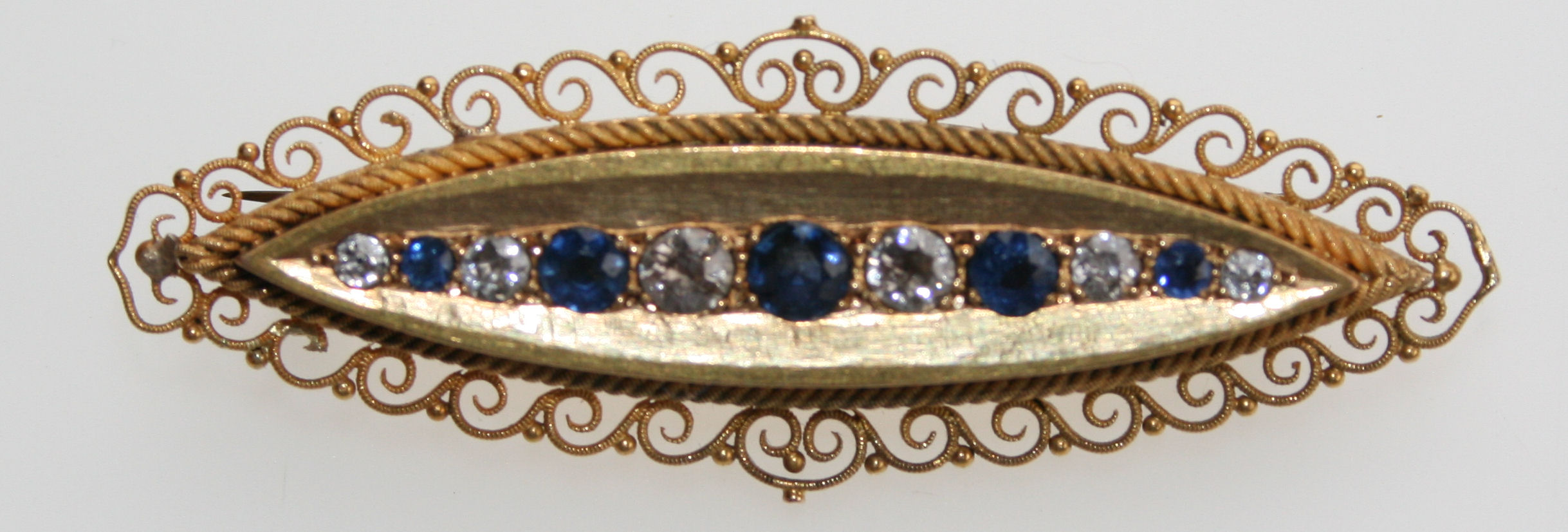 of navette form rope twist border, outer scroll frame, the central panel set with alternating graduated circular cut sapphires and diamonds