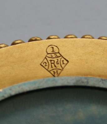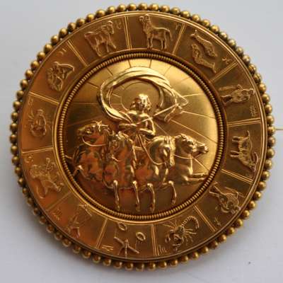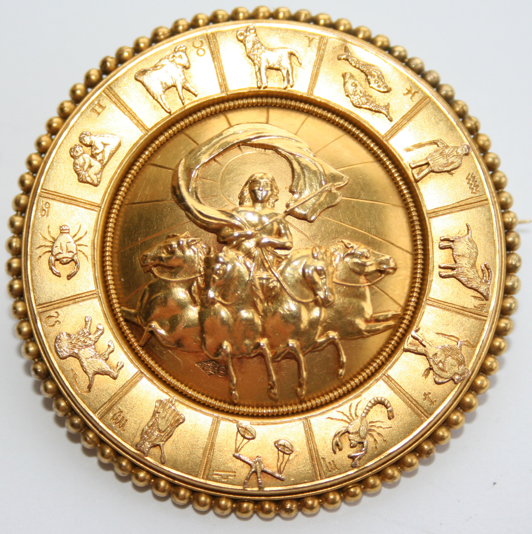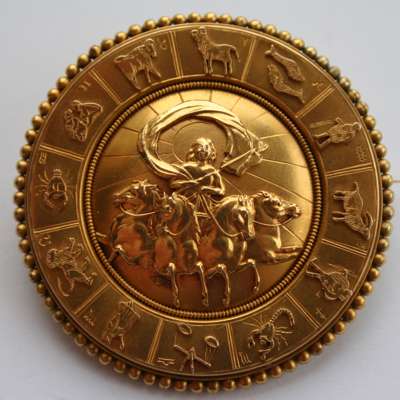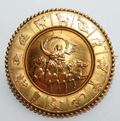 the circular raised boss with Aurora in her chariot and a border of the signs for the Zodiac, beaded border, glazed compartment to the rear, engraved registration lozenge for 1873, other wise unmarked