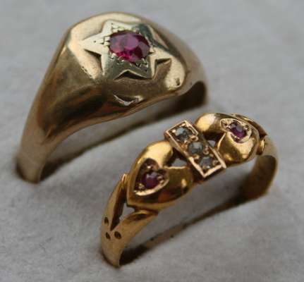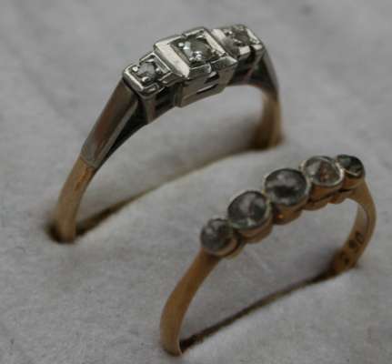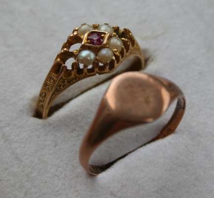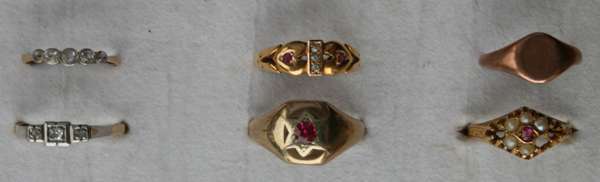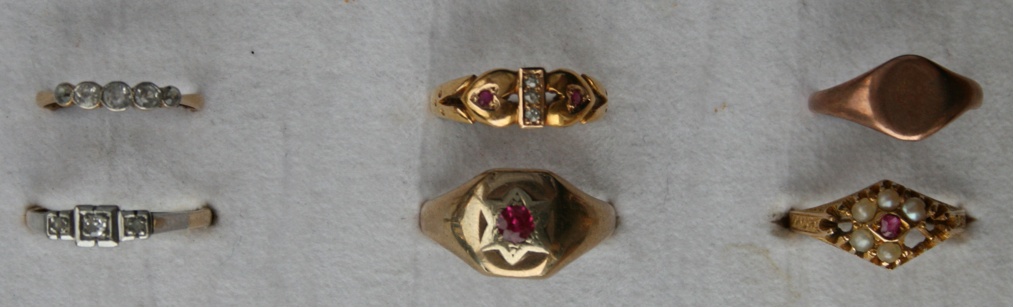 to include pearl and ruby, signet ring, an illusion set diamond ring five stone diamond ring (6)