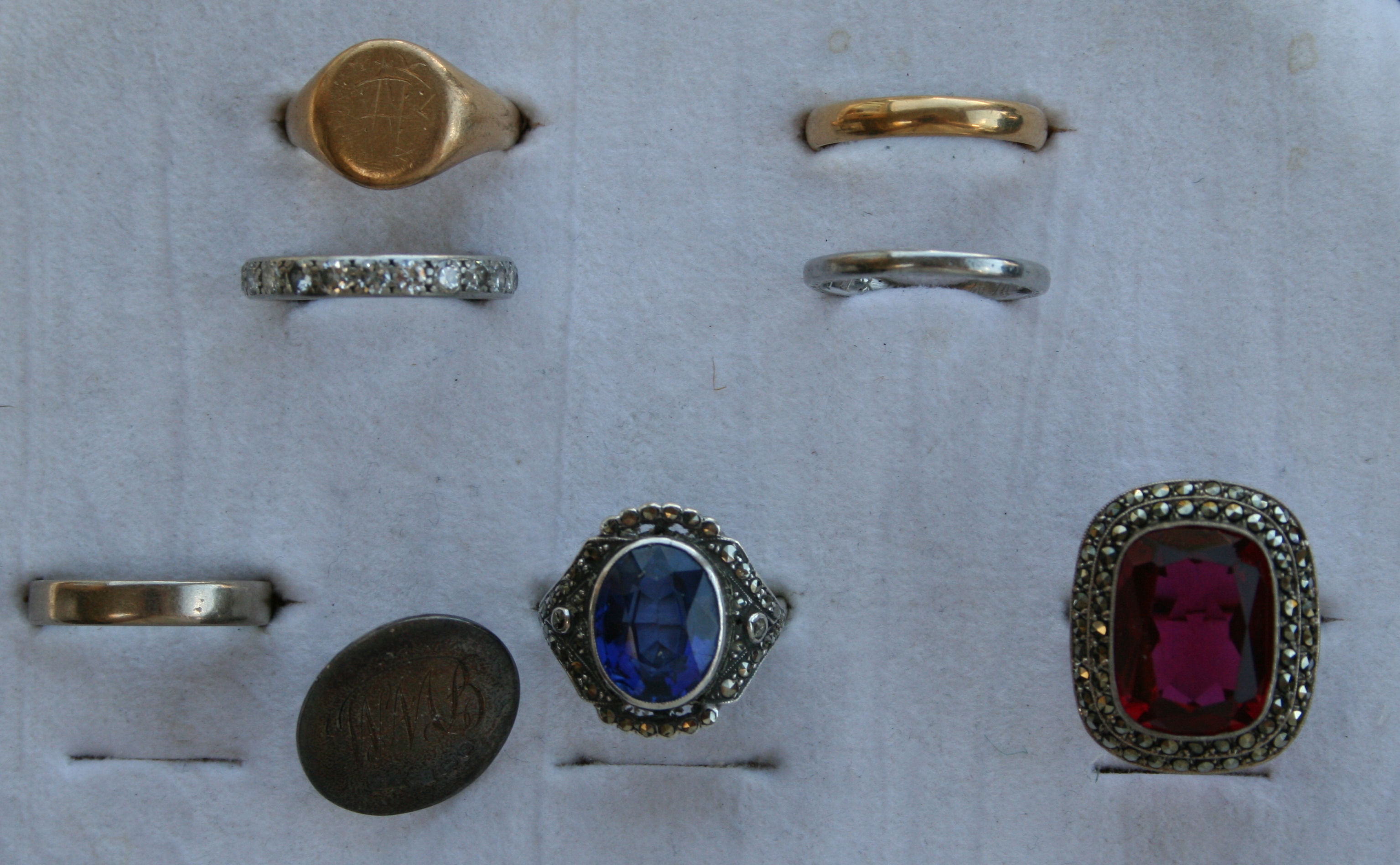 together with an eternity ring; an 18ct white gold band; an 18ct gold band; a signet ring; two marcasite dress rings; a silver golf marker