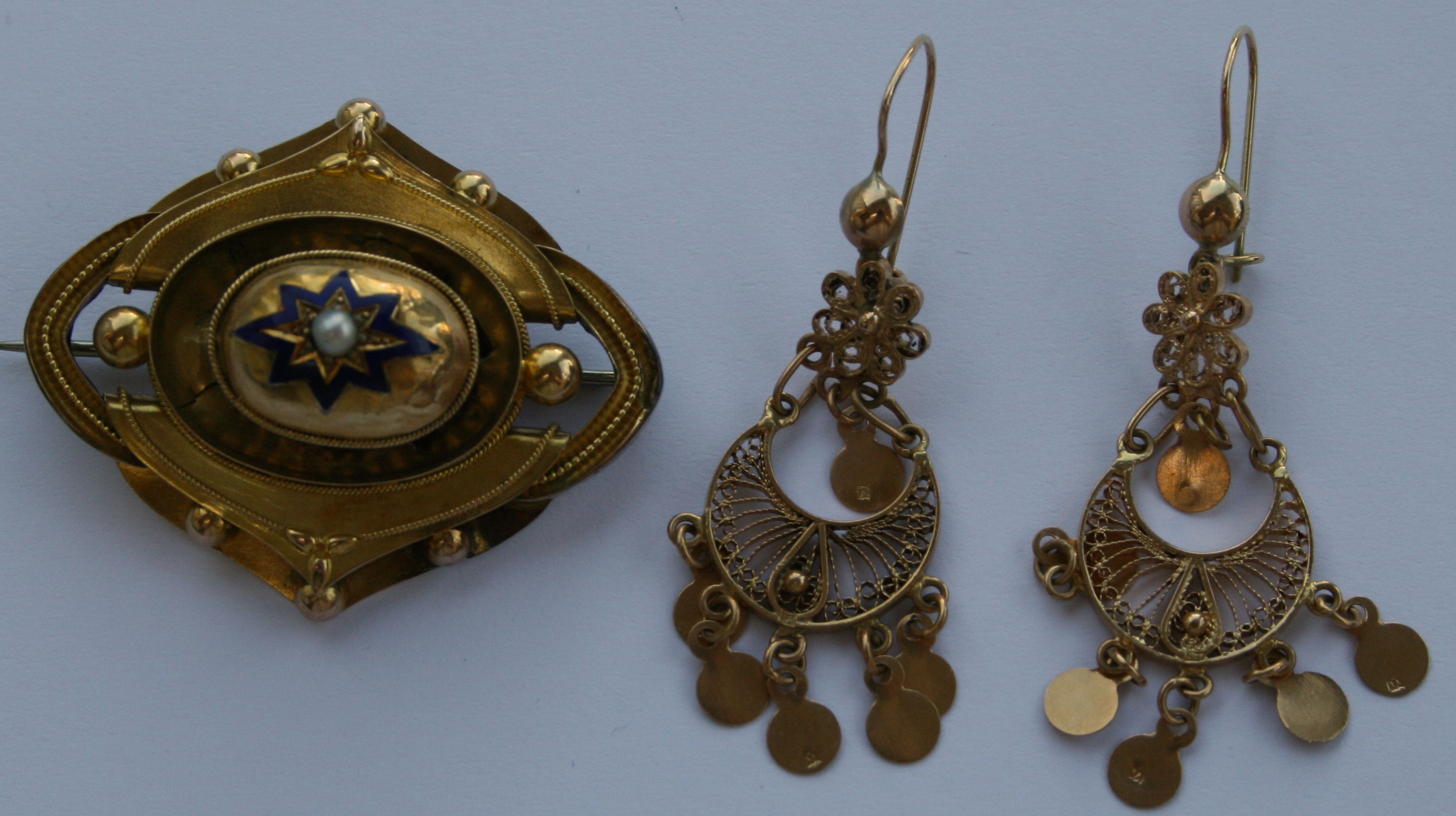 with a Victorian brooch of oval form set central pearl within enamel star border, shaped outer border