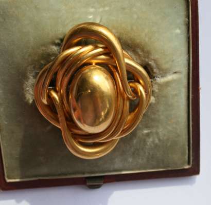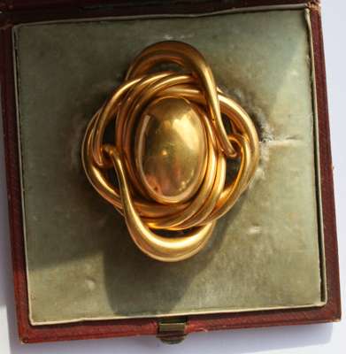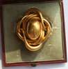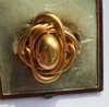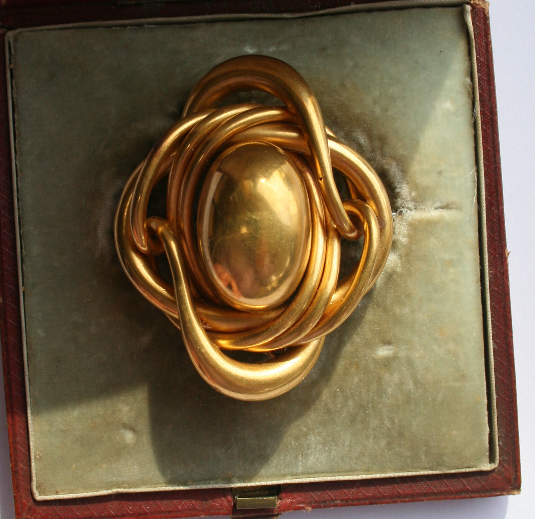 of bold form scrolling around an oval cabochon all in yellow metal, all in a fitted Victorian case