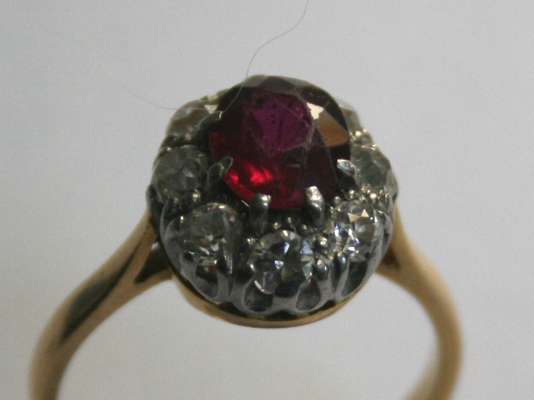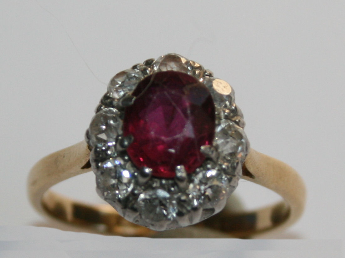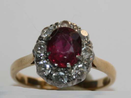 designed as an oval cluster, claw set to the centre with an oval cut ruby, within a surround of eight old European cut diamonds