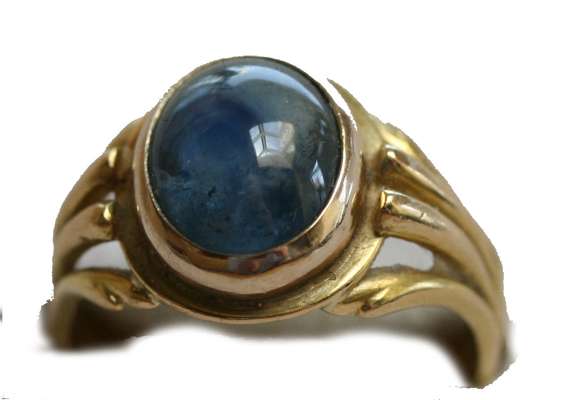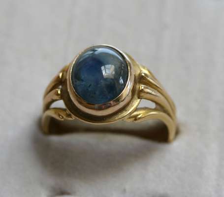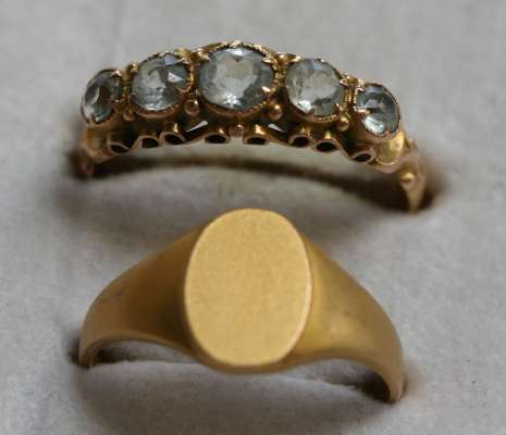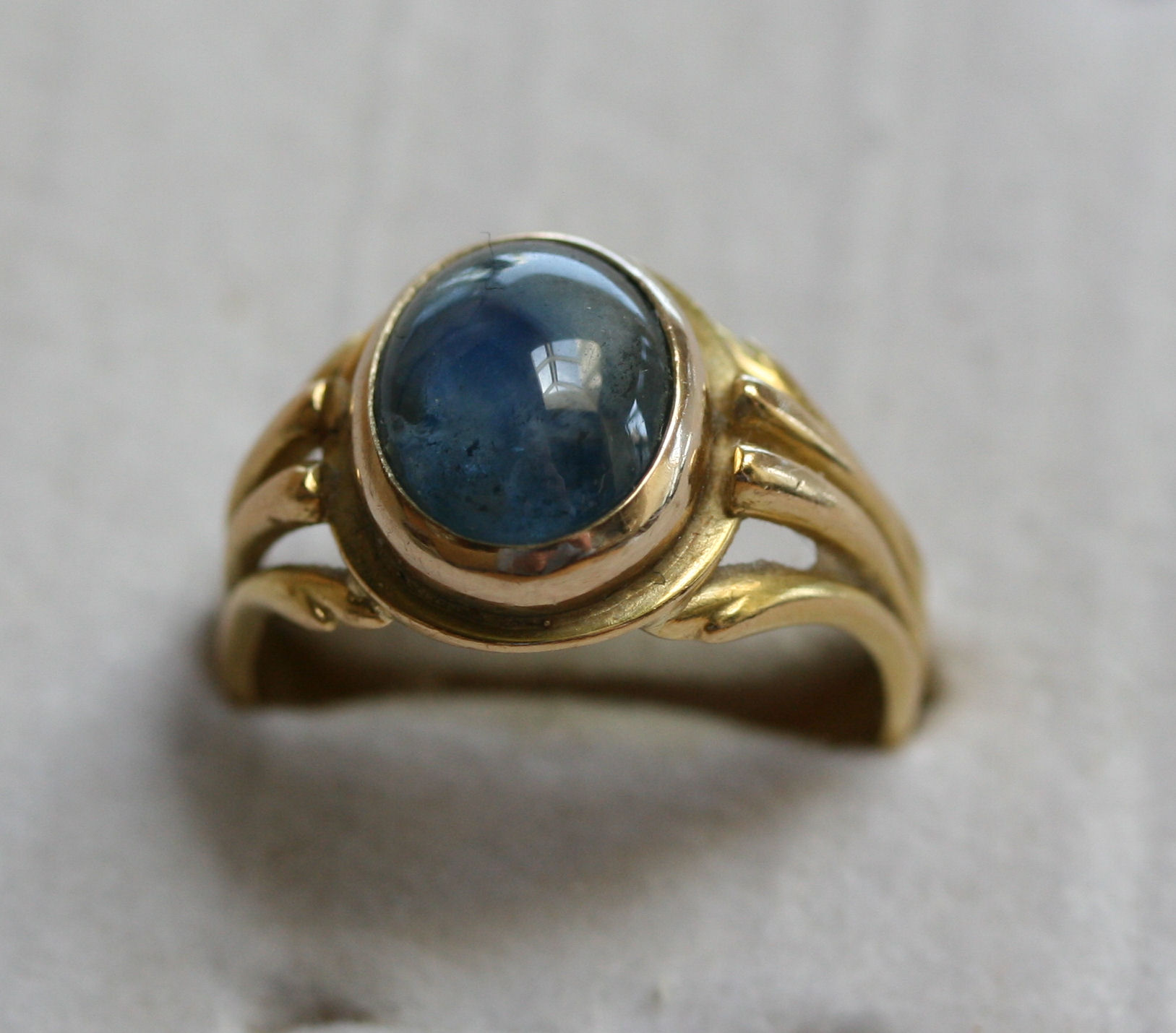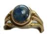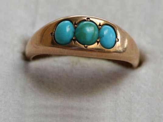 a sapphire cabochon ring, a ring set turquoises, another set pearl and turquoise, paste set ring, a signet ring (5)