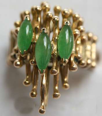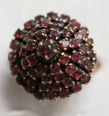 a stepped garnet cluster; a large sapphire set cluster; a contemporary jadeite set ring; a synthetic alexandrite ring; a cornelian set ring (5)
