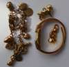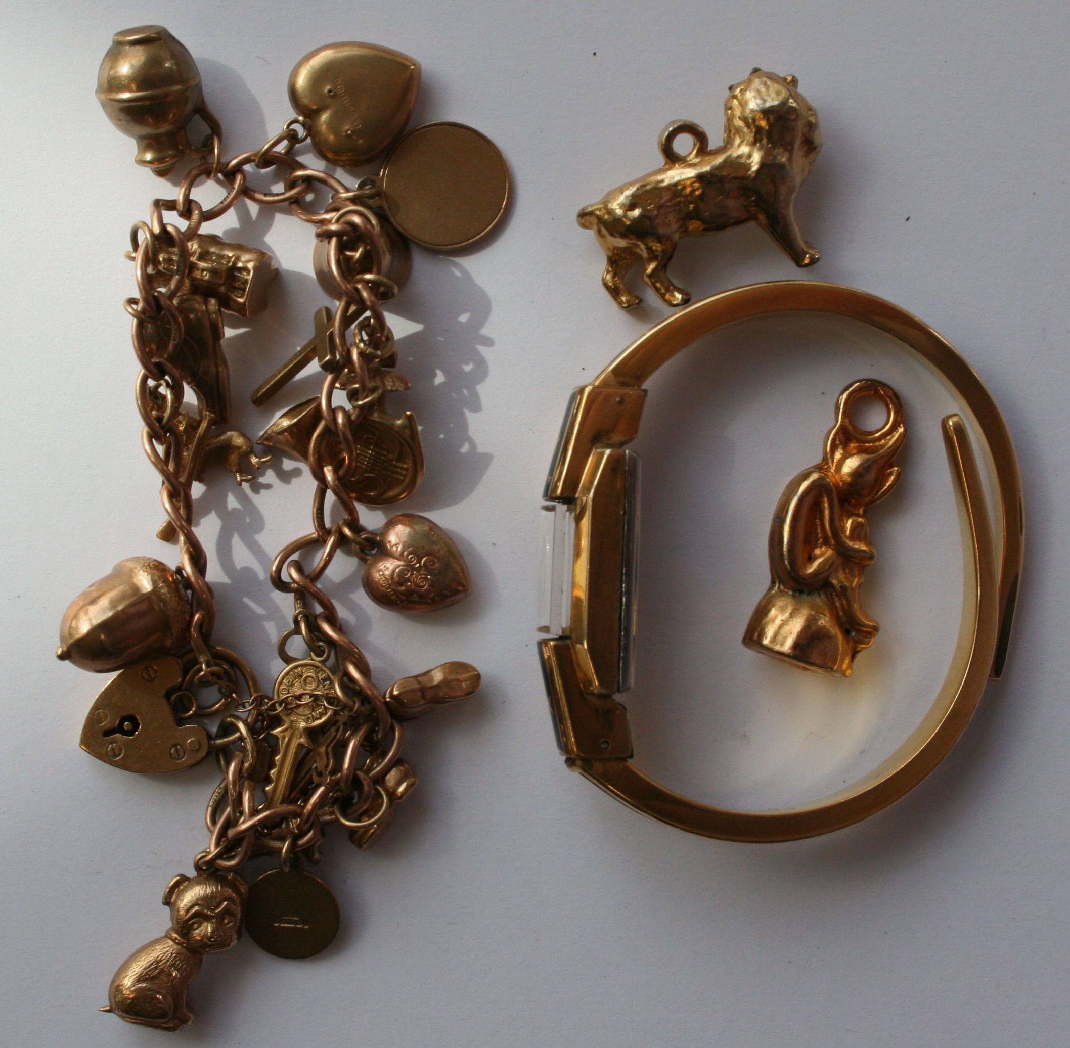 of curb links and a number of charms, together with two other gilt charms and a bangle wrist watch