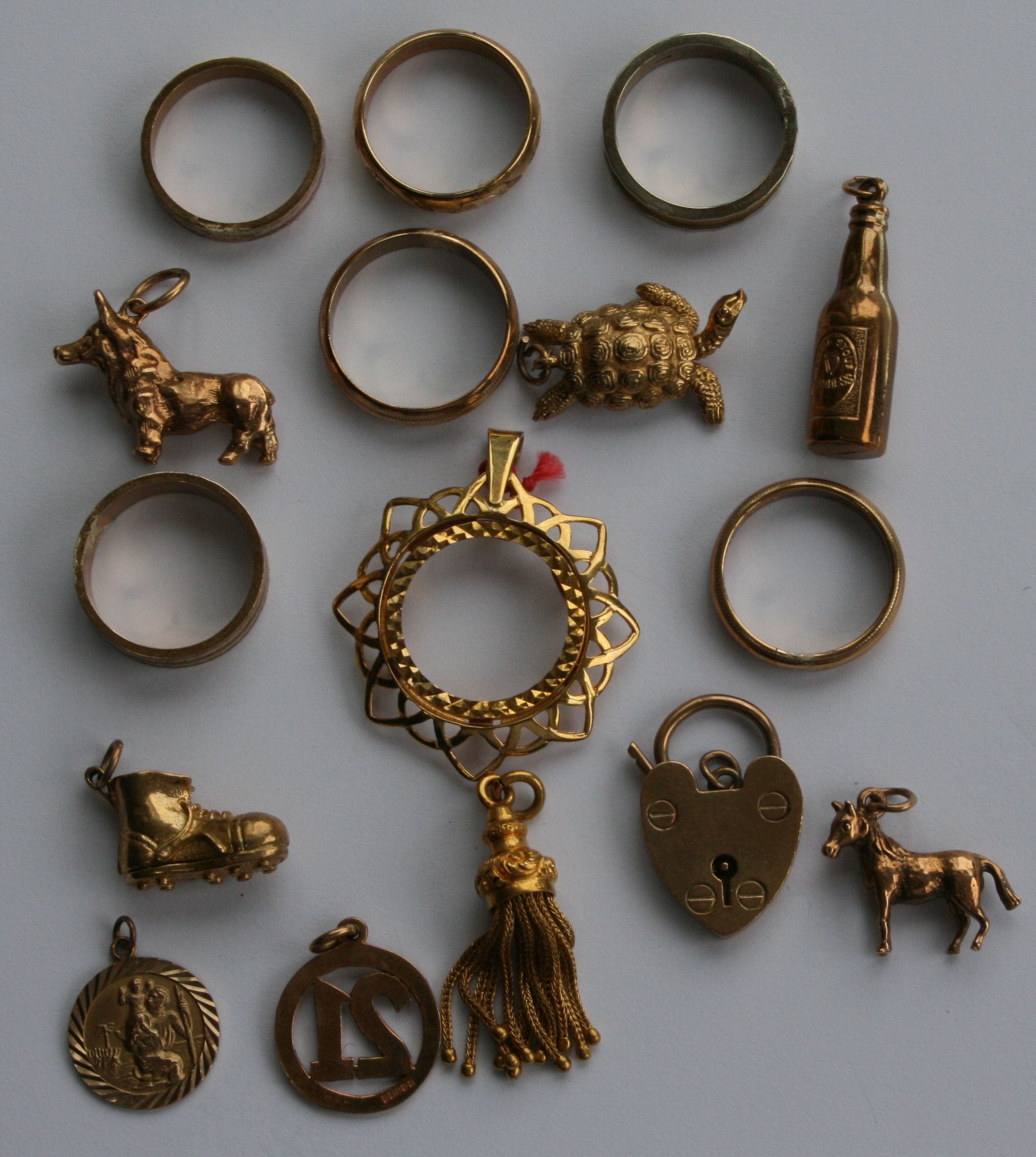 six 9ct gold wedding bands; a group of 9ct gold charms and a gilt chain (Qty)