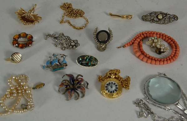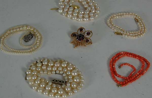 as a tied floral spray; a graduated strand of pearls (untested) with a diamond set bar clasp; various other pearl necklaces; two sets of coral beads; various brooches; costume jewellery etc. (Qty)