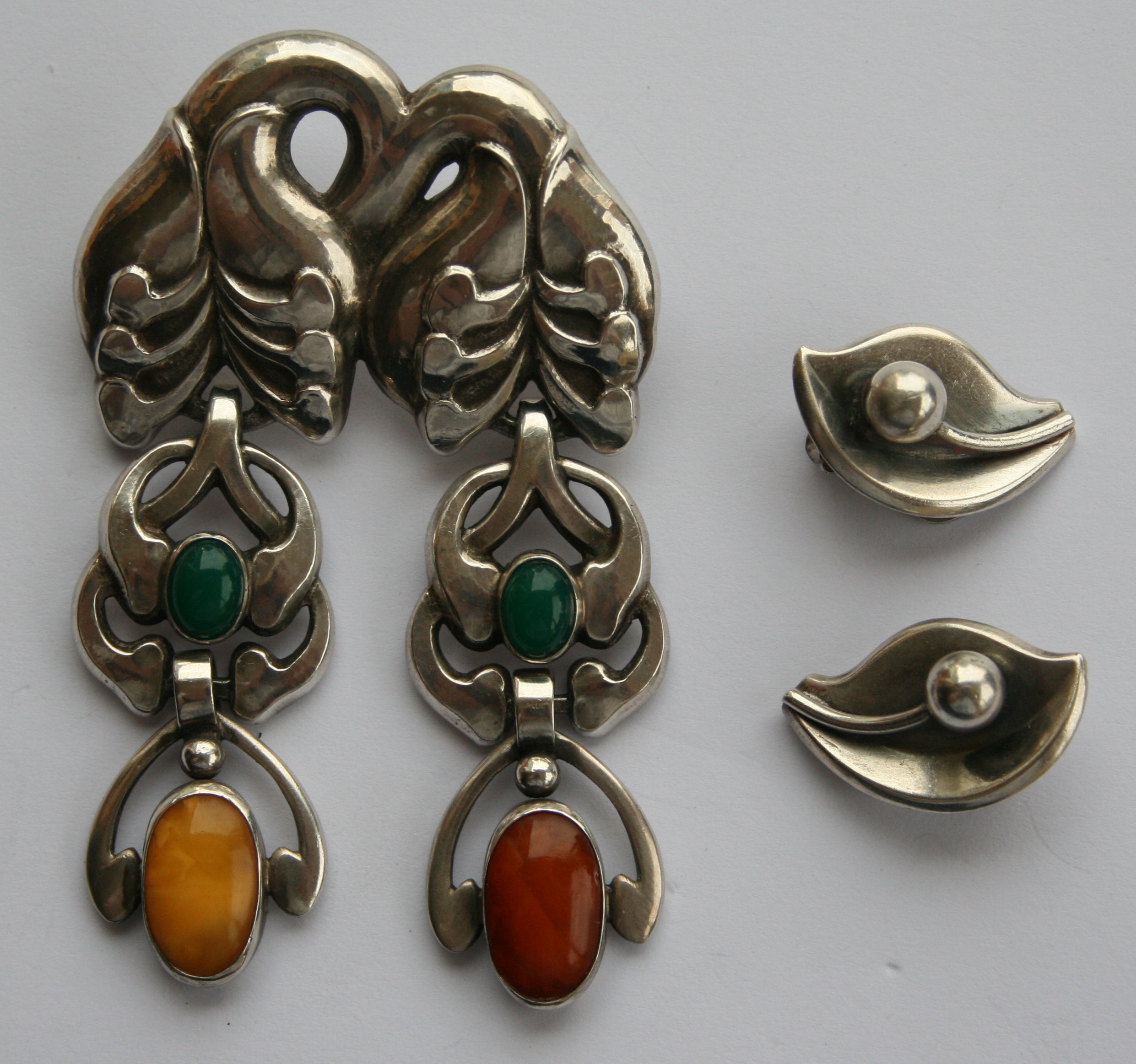 the two fruits with suspended scrolls set vari-coloured cabochons, engraved to the rear; GJ., 830, and numbered 131; together with a pair of Danish silver ear clips