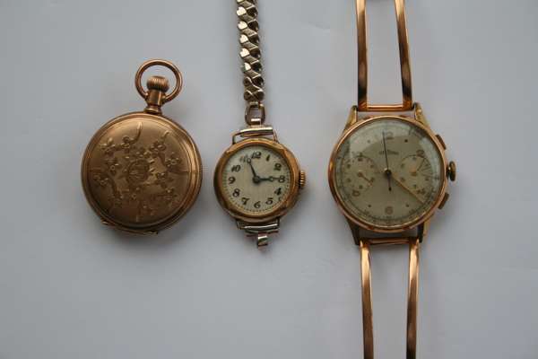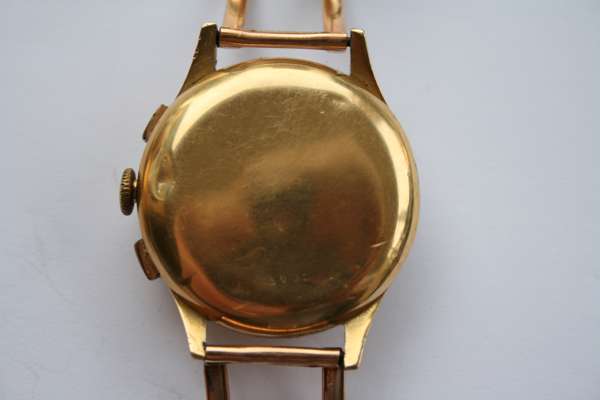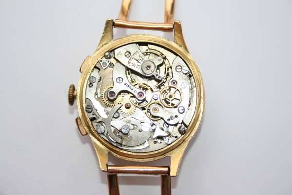 circa 1950, the dial with push button stop start reset, subsidiary seconds dial, second chronograph outer dial, further subsidiary minute recorder dial, case numbered to inside 74691, outer cover numbered 3901, 18ct gold skeletal hinged bracelet; together with a gold wrist watch head and a gilt cased fob watch (3)