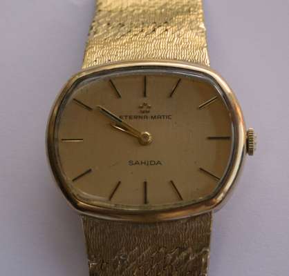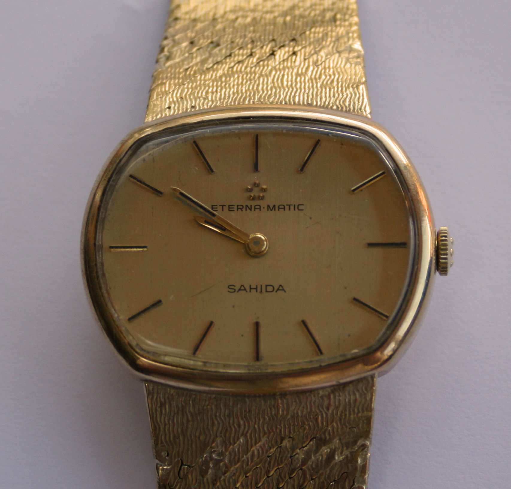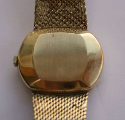 the rounded rectangular champagne dial with baton numerals, gold mesh bracelet